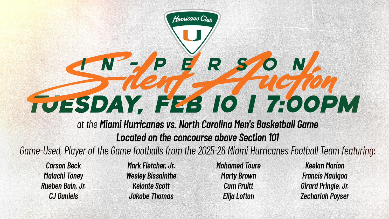 On Tuesday, February 10th, at 7:00 PM at the Watsco Center, the Hurricane Club will host an in-person, silent auction located above section 101 on the concourse until the end of halftime, featuring official game-used, signed footballs from the 2025–26 Miami Hurricanes football season.