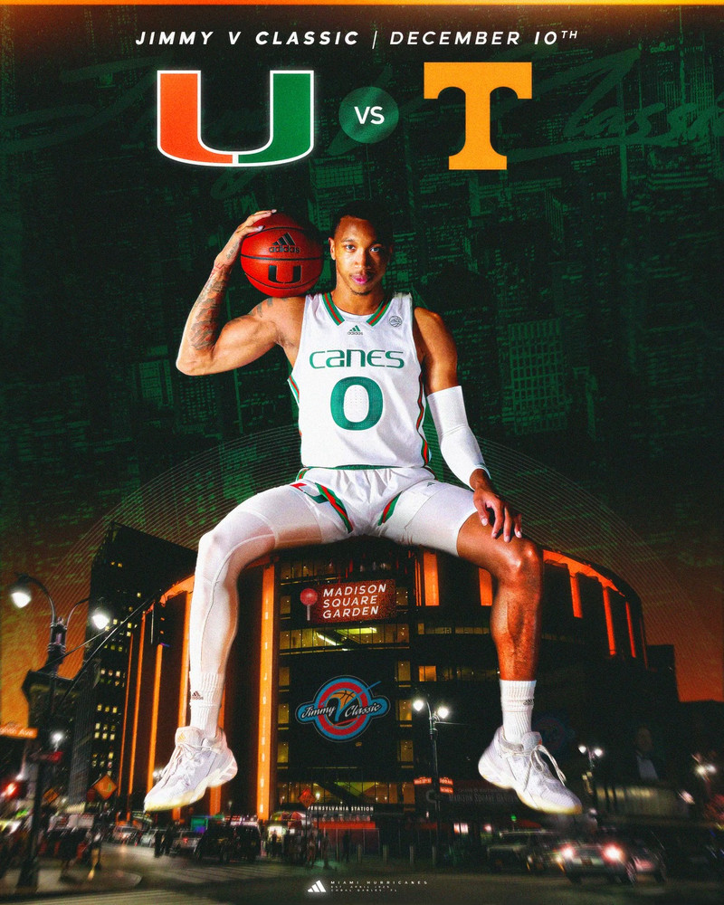CORAL GABLES, Fla. – The University of Miami men’s basketball program will face the Tennessee Volunteers in the 2024 Jimmy V Men’s Classic, as announced Wednesday afternoon by ESPN Events.