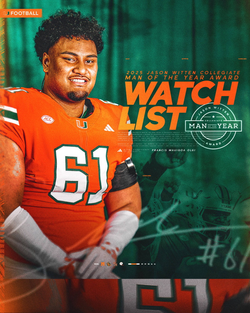 CORAL GABLES, Fla. – Miami offensive lineman Francis Mauigoa has been named to the watch list for the 2025 Jason Witten Collegiate Man of the Year Award, as announced Tuesday by the award’s selection committee.
