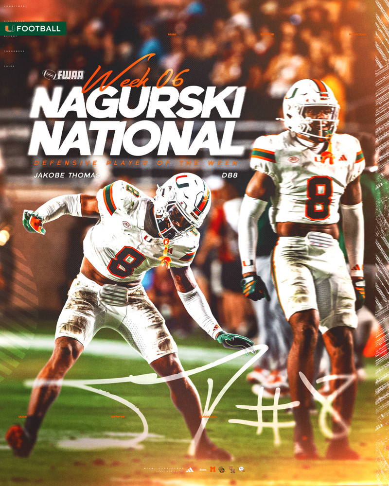 CORAL GABLES, Fla. – Miami defensive back Jakobe Thomas was named the Bronko Nagurski National Defensive Player of the Week, the Football Writers Association of America (FWAA) announced Tuesday.