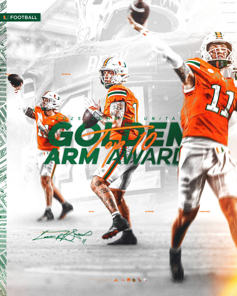 CORAL GABLES, Fla. – Miami quarterback Carson Beck has been named one of the Top 10 candidates for the 2025 Johnny Unitas Golden Arm Award, presented annually to the nation’s top upperclassman quarterback who best exemplifies character, leadership and excellence on and off the field.