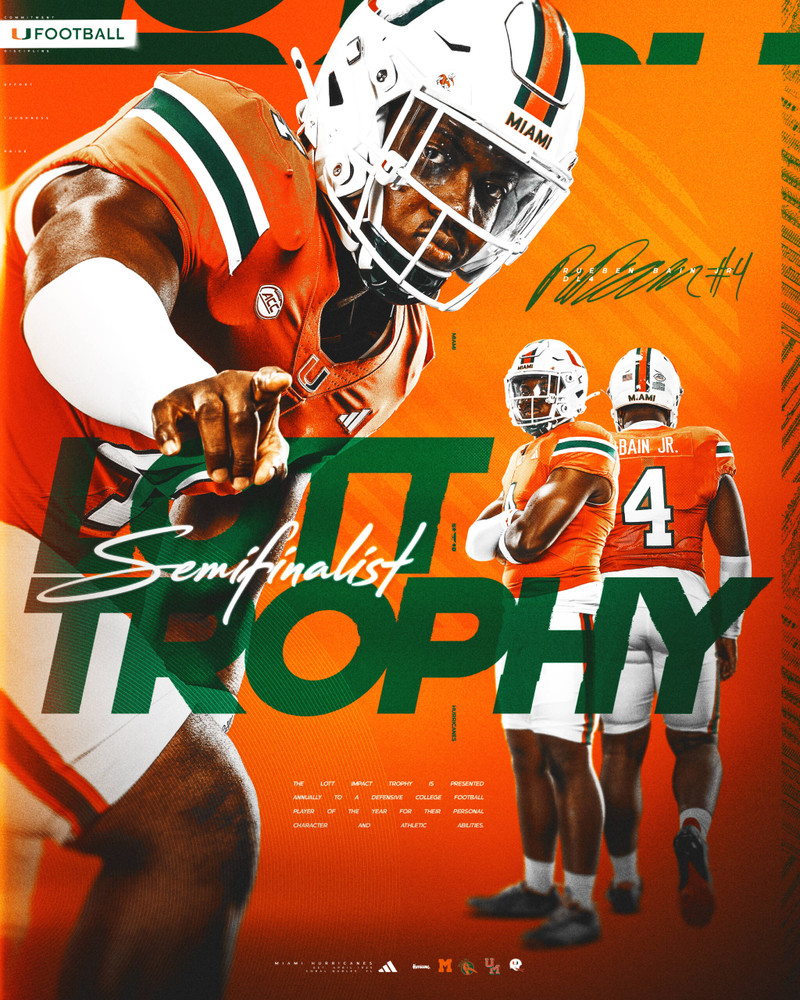 CORAL GABLES, Fla. – Miami defensive lineman Rueben Bain Jr. has been selected as a semifinalist for the Lott IMPACT Trophy, presented annually to the defensive player who best combines athletic performance with integrity, maturity, performance, academics, community and tenacity.