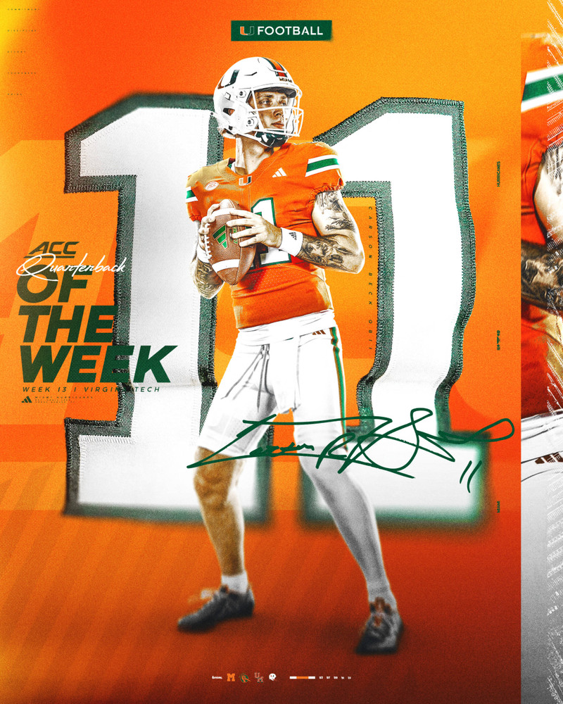 CORAL GABLES, Fla. – Miami quarterback Carson Beck and defensive lineman Akheem Mesidor were honored by the ACC on Monday, earning ACC Quarterback of the Week and ACC Defensive Lineman of the Week, respectively, following the Hurricanes’ 34-17 victory over Virginia Tech.