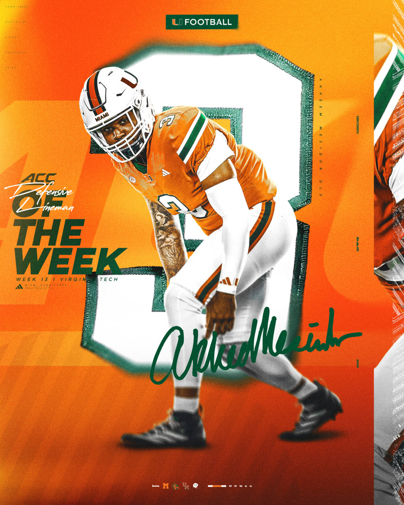 Mesidor anchored Miami’s defensive front, recording five total tackles, including three solo, along with 1.5 tackles for loss, one sack, and a quarterback hurry. He helped lead a defense that posted nine tackles for loss, five sacks, and limited the Hokies to 17 points.