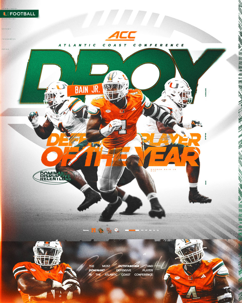 Bain’s conference honor continues an already decorated career for the Hurricanes. The true junior from Miami, Fla., burst onto the scene in 2023 when he was named the ACC Defensive Rookie of the Year, producing 44 tackles, 12.5 tackles for loss, 7.5 sacks and three forced fumbles as a true freshman.
