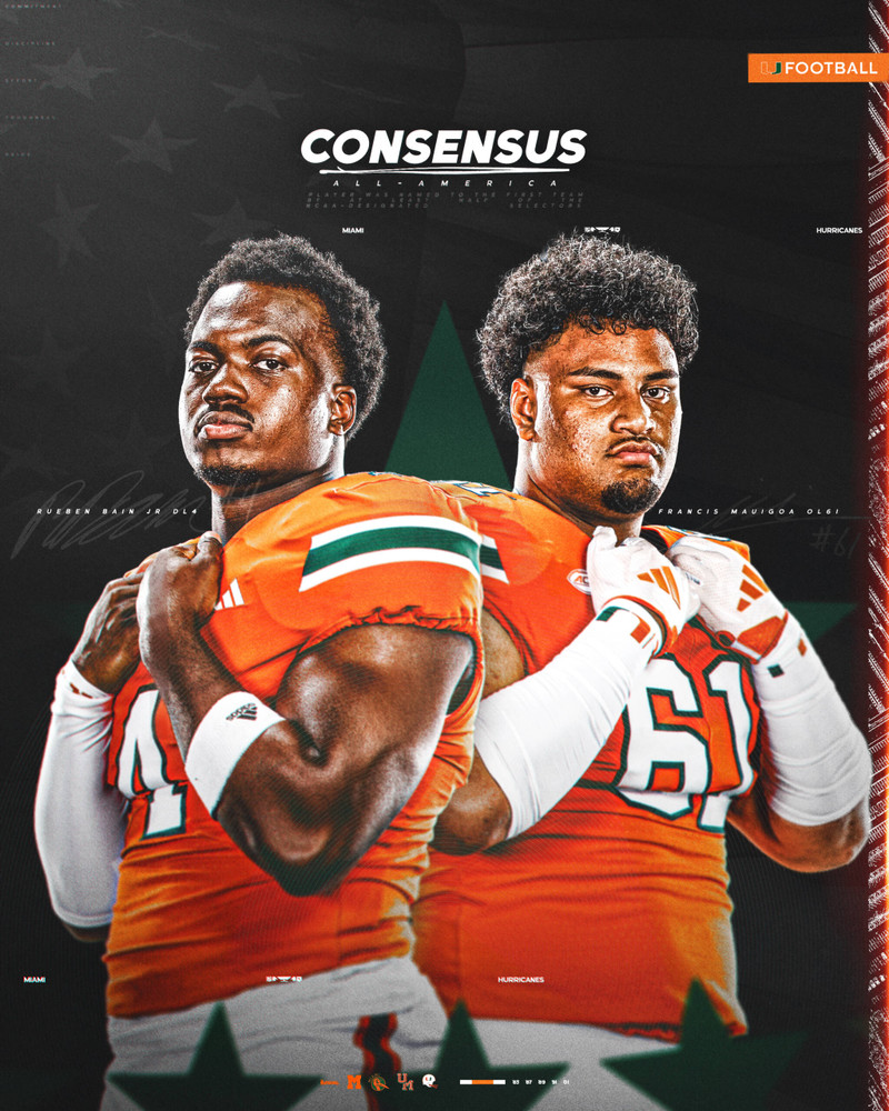 CORAL GABLES, Fla. – Miami defensive lineman Rueben Bain Jr. and offensive lineman Francis Mauigoa have been named Consensus All-Americans, formally announced by the NCAA on Friday.