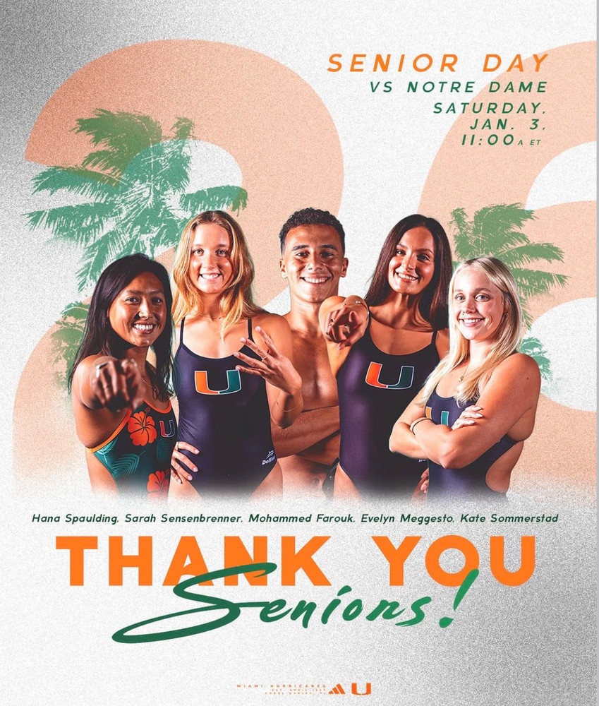 It was Senior Day for the Canes as four swimmers (Evelyn Meggesto, Sarah Sensenbrenner, Kate Sommerstad, Hana Spaulding) and one diver (Mohamed Farouk) were recognized before the meet.