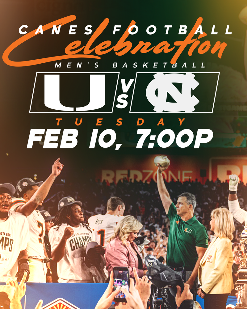 CORAL GABLES, Fla. – University of Miami Athletics announced Tuesday that the Hurricanes football team, which advanced to the College Football Playoff National Championship Game this past season, will be honored at halftime of Miami’s men’s basketball game vs. North Carolina on Tuesday, February 10.