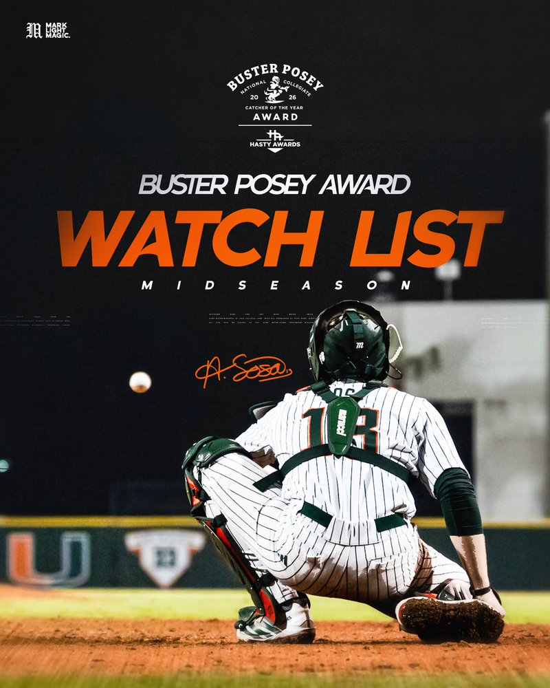 CORAL GABLES, Fla. – Miami catcher Alex Sosa has been named to the Buster Posey Award Midseason Watch List, recognizing the nation’s top catcher.