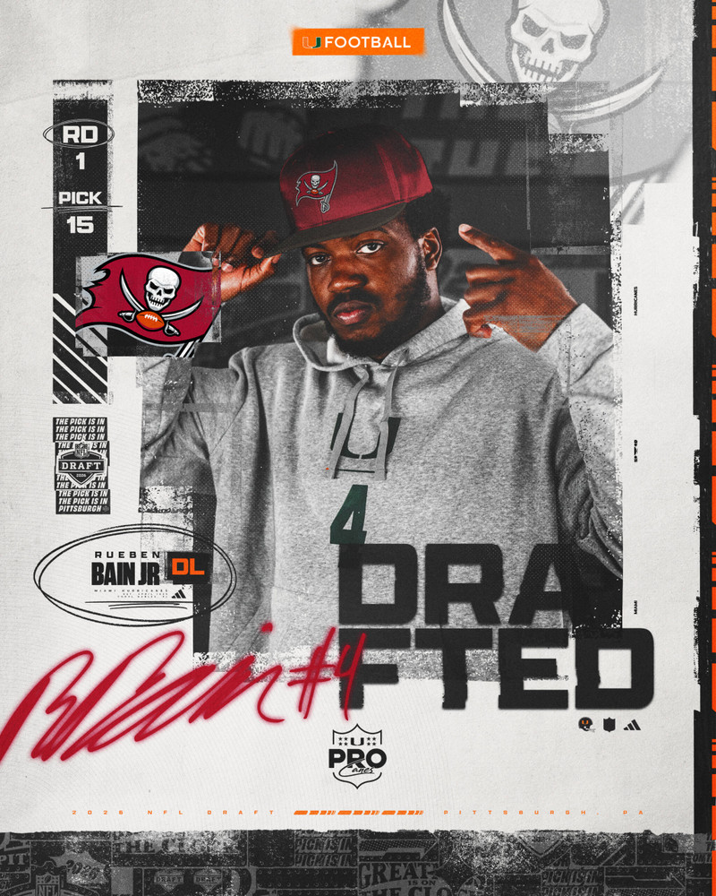 PITTSBURGH — University of Miami defensive lineman Rueben Bain Jr. was selected by the Tampa Bay Buccaneers with the 15th overall pick in the first round of the 2026 NFL Draft on Thursday night at Acrisure Stadium.