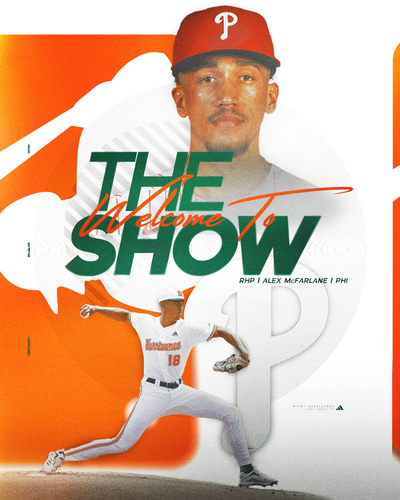 CORAL GABLES, Fla. – Former Miami Hurricanes right-handed pitcher Alex McFarlane has been called up by the Philadelphia Phillies and is set to make his Major League debut Friday night against the Atlanta Braves.