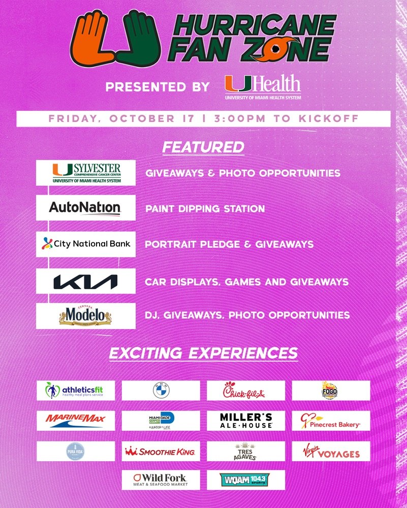 Pregame with the Canes before every home game at the UHealth Fan Zone, the perfect destination with food, beverages, music, and more! Located in the South Plaza, the Fan Zone will be open from 3:00 PM until kickoff at 7:00 PM.